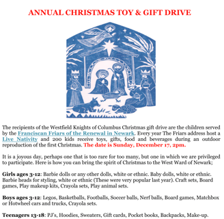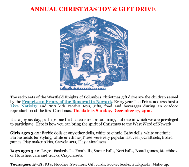 1) Drop-off your toys/gifts (wrapped/unwrapped) downstairs at the Knights of Columbus Hall at 2400 North Avenue (next to Charley Brown’s) Scotch Plains. Simply go to the downstairs bar area between the hours of 3-8pm. While there hoist a Christmas toast of gratitude.